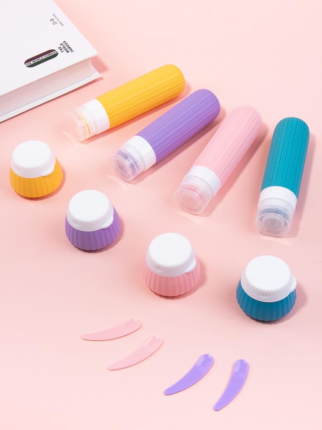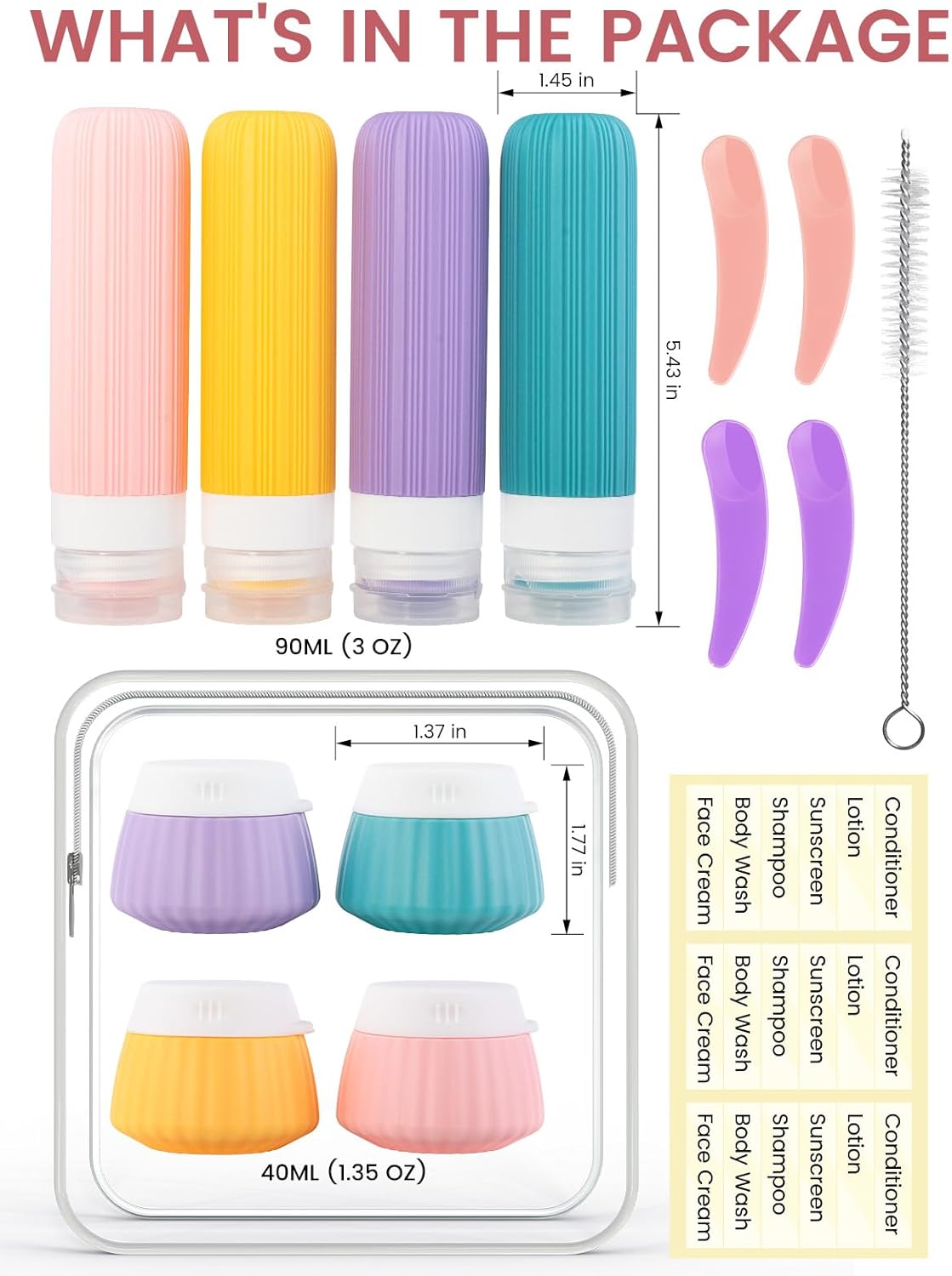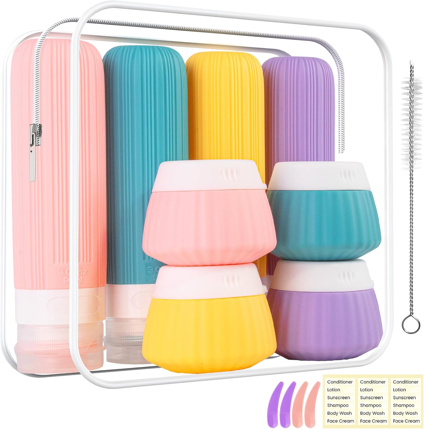 【All-in-One Travel Size Toiletries】This 8 pack of travel bottles for toiletries includes 4 silicone squeeze bottles(3oz) and 4 cream jars(1.35oz), plus a clear TSA approved bag, labels, brush, and spatulas—perfect for all your vacation and airplane travel needs.