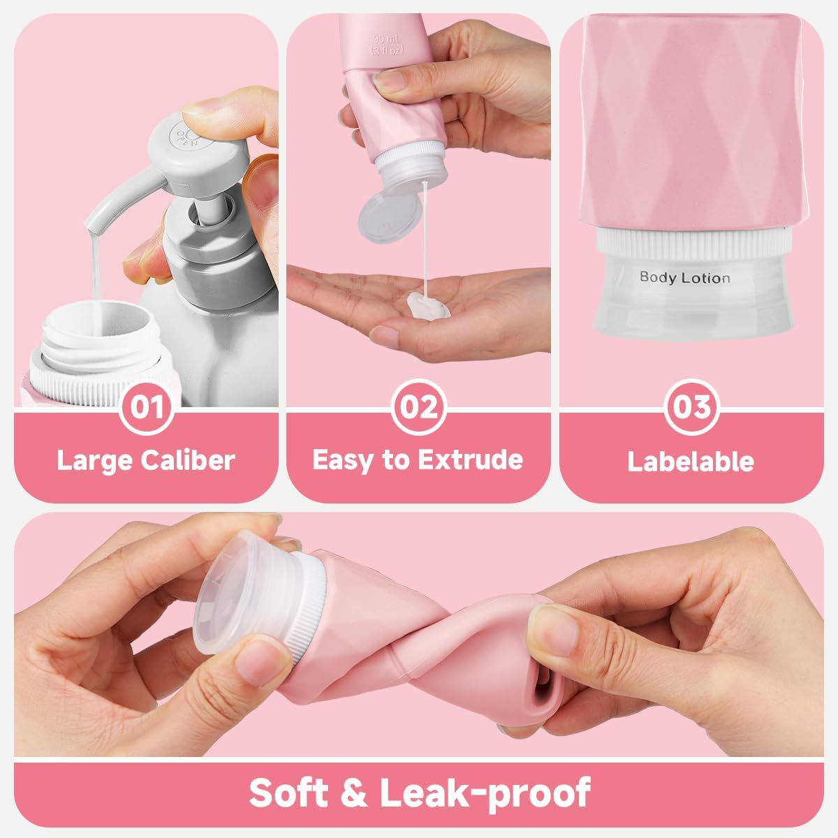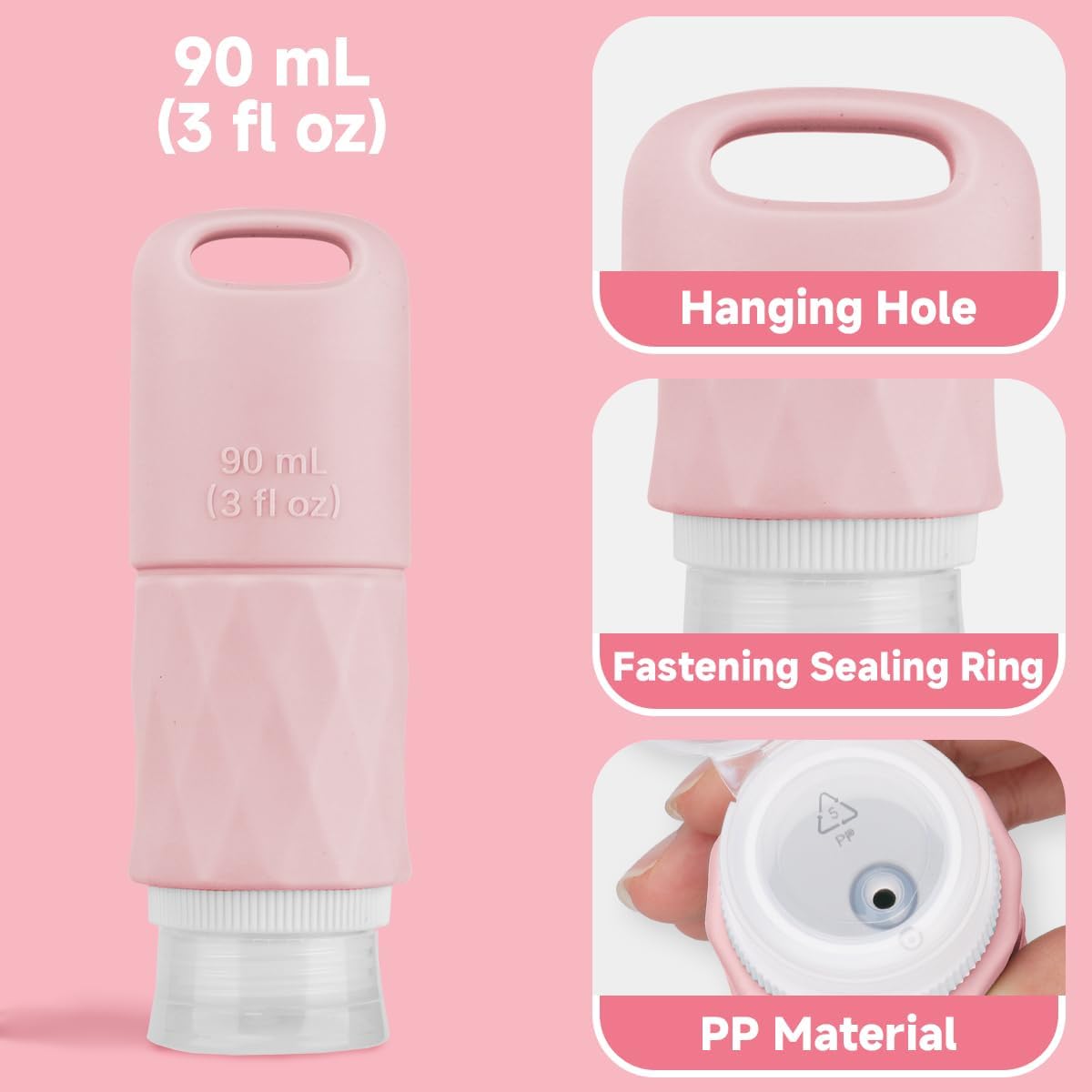 【Complete Travel Kit】The set contains 4 x 90 mL silicone travel bottles (TSA-compliant size), 4 x 10g cream jars, 2 x 30 mL refillable spray bottles, 1 x clear waterproof toiletry bag, 1 funnel and 1 sticker.