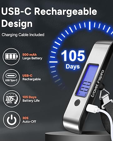 Capacity – 110lb/50kg, Graduation: 0.1lb/50g,Cool Backlight LCD Display – Easy to read in dim light;Rubber Paint Handle – Provides with a comfort grip when weighing your luggage.
