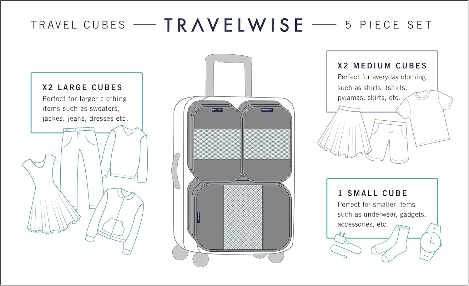 PACKING MADE EASY – This 5 piece travel organizer set (1 small, 2 medium and 2 large packing cubes) compartmentalizes similar size items in their own “small drawers” to streamline packing and more efficiently utilize interior luggage space.