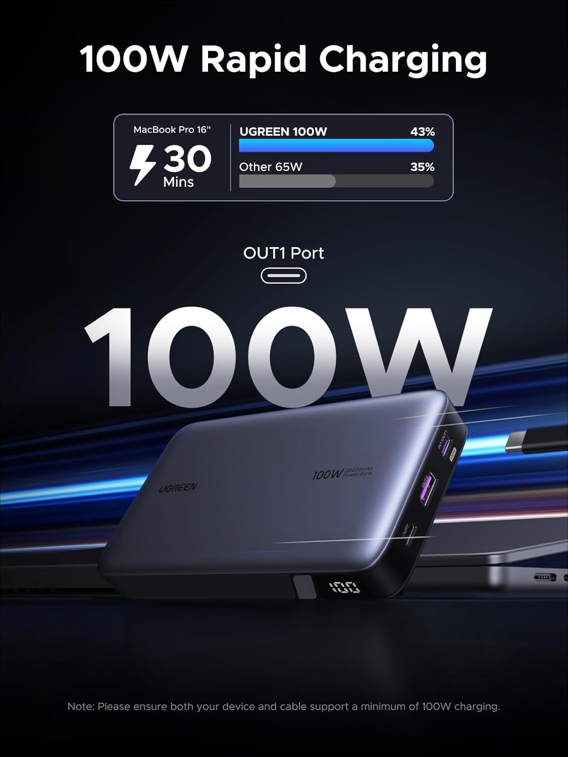 High Speed Charging 100W: Macbook Pro 16″ can be charged to 42% in just 30 mins via OUT1, and iPhone 16 can fast fuel to 60% in 30 mins. Less time to wait, more time to enjoy