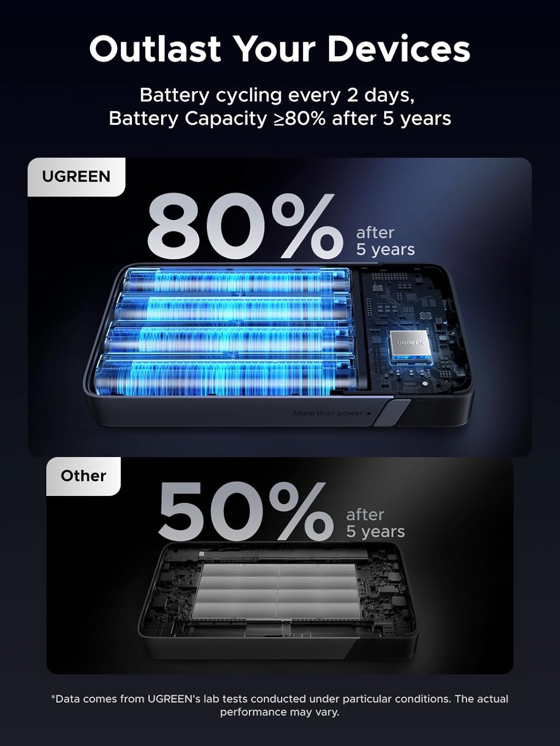 High Capacity 20000mAh: UGREEN USB C Power Bank 20000mAh can meet up to 5 days of battery life, fully charge MacBook Air 15” up to 1.1 times, ideal for high power needed devices