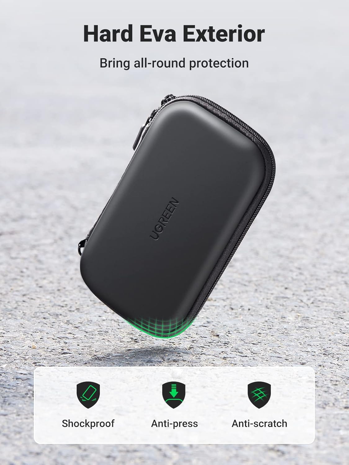 UGREEN Hard Drive Case is designed to protect and organize your electronics such as 2.5 inch hard drives, USB cables, power bank, earphones and more. Exterior size: 6.5in x 3.74in x 1.77in; Interior size: 5.51in x 3.35in x 1.57in. Please be kindly noted that it only suitable for 2.5 inch hard drive and power bank 5.9in x 3.1in max