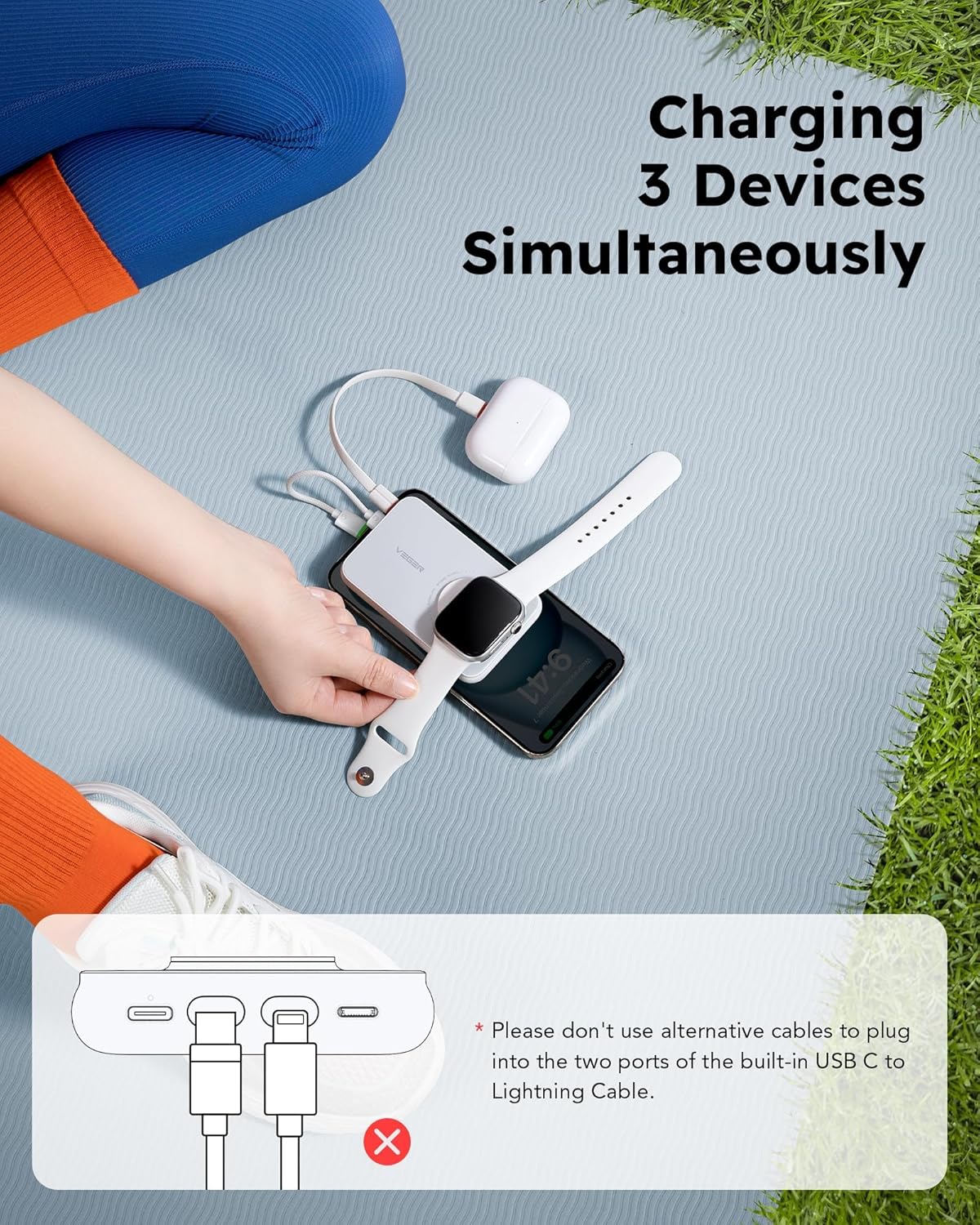 【All-in-One Apple Charging】Features a built-in bidirectional USB-C to Lightning cable (perfect for iPhone) and a dedicated magnetic Apple Watch charger. Power up your essential trio: iPhone, Apple Watch, AirPods, and Android phones seamlessly with one compact device. Note: Built-in cable ports are exclusive to our cables.