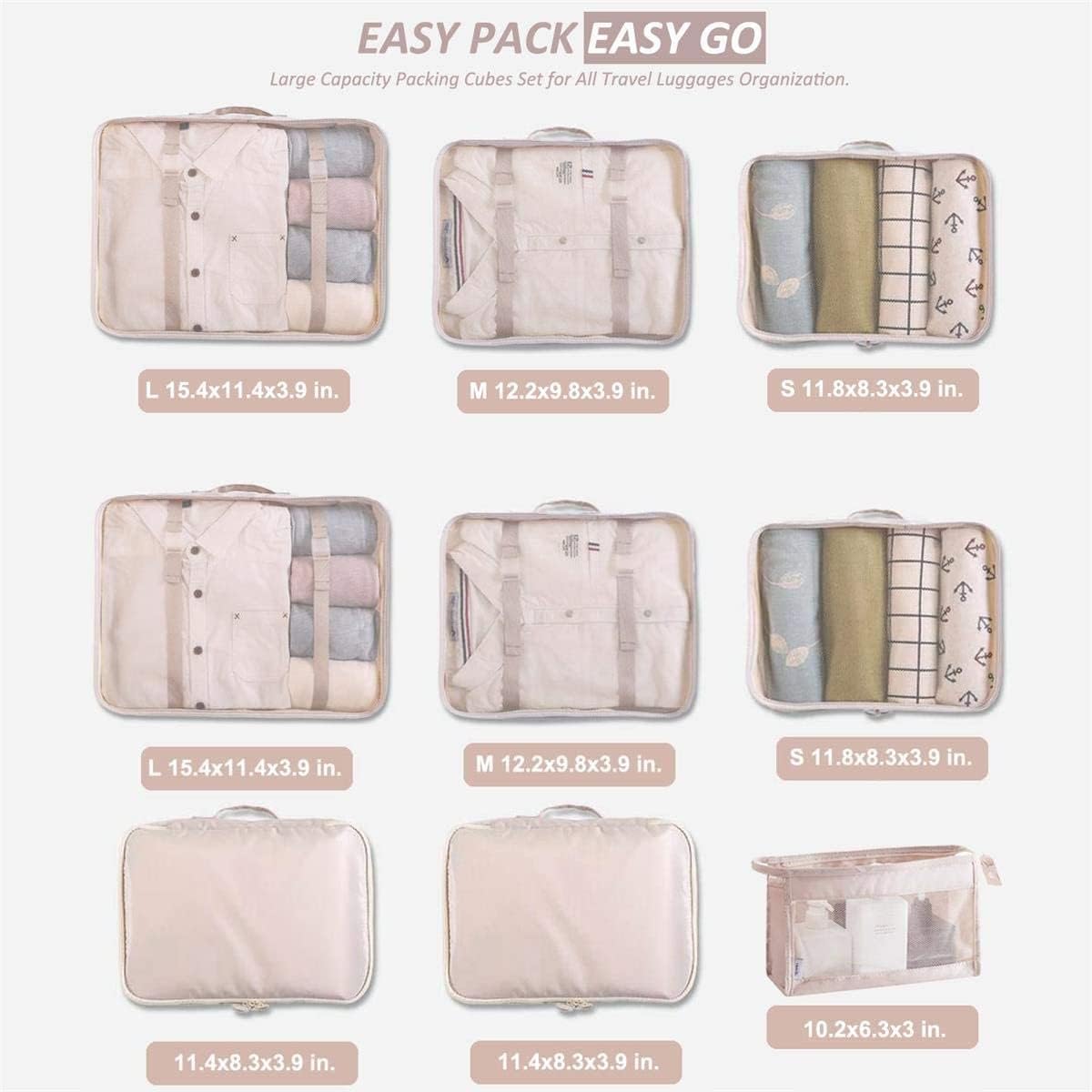 9PCS Luggage Organizer Bags includes 2 Large Clothes Storage Cube, 2 Medium Clothes Storage Cube, 2 Small Clothes Storage Cube, 2 Bra Underwear Case, 1 toiletry bag.
