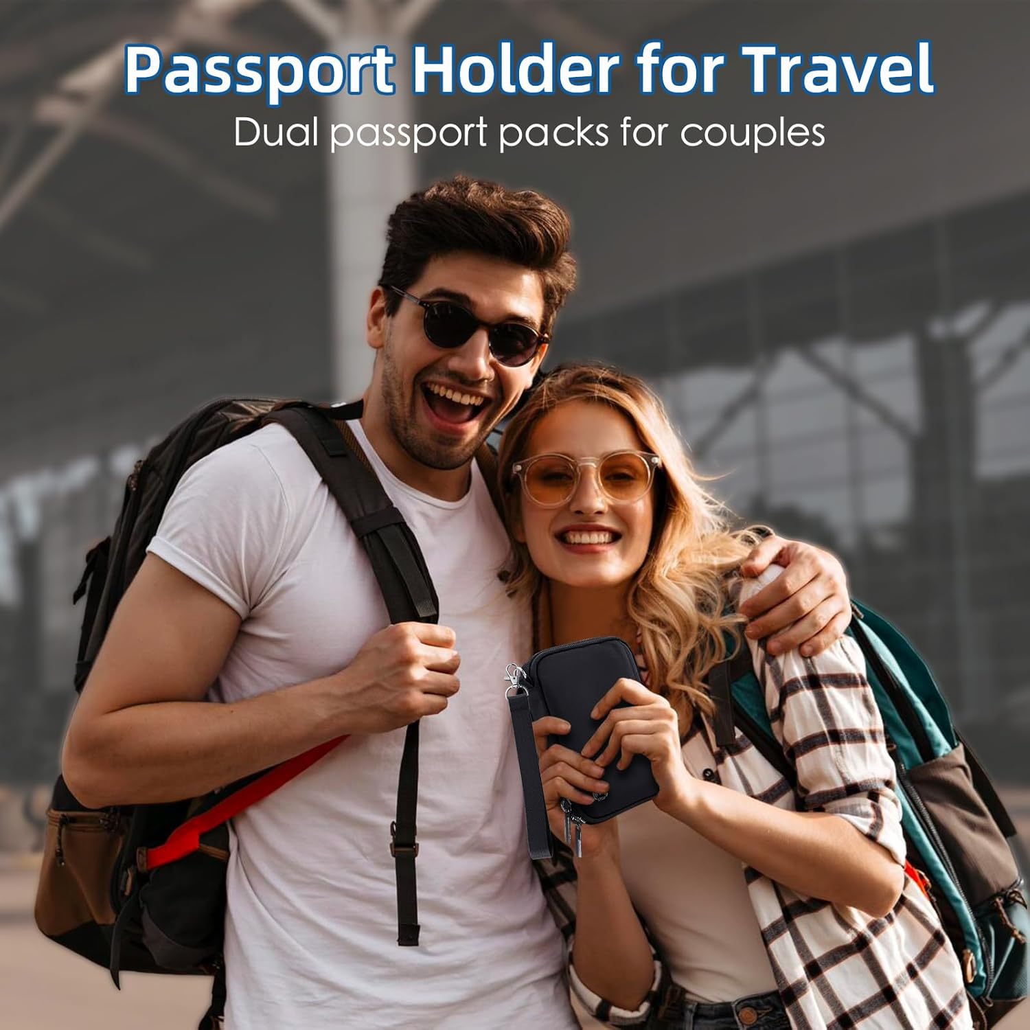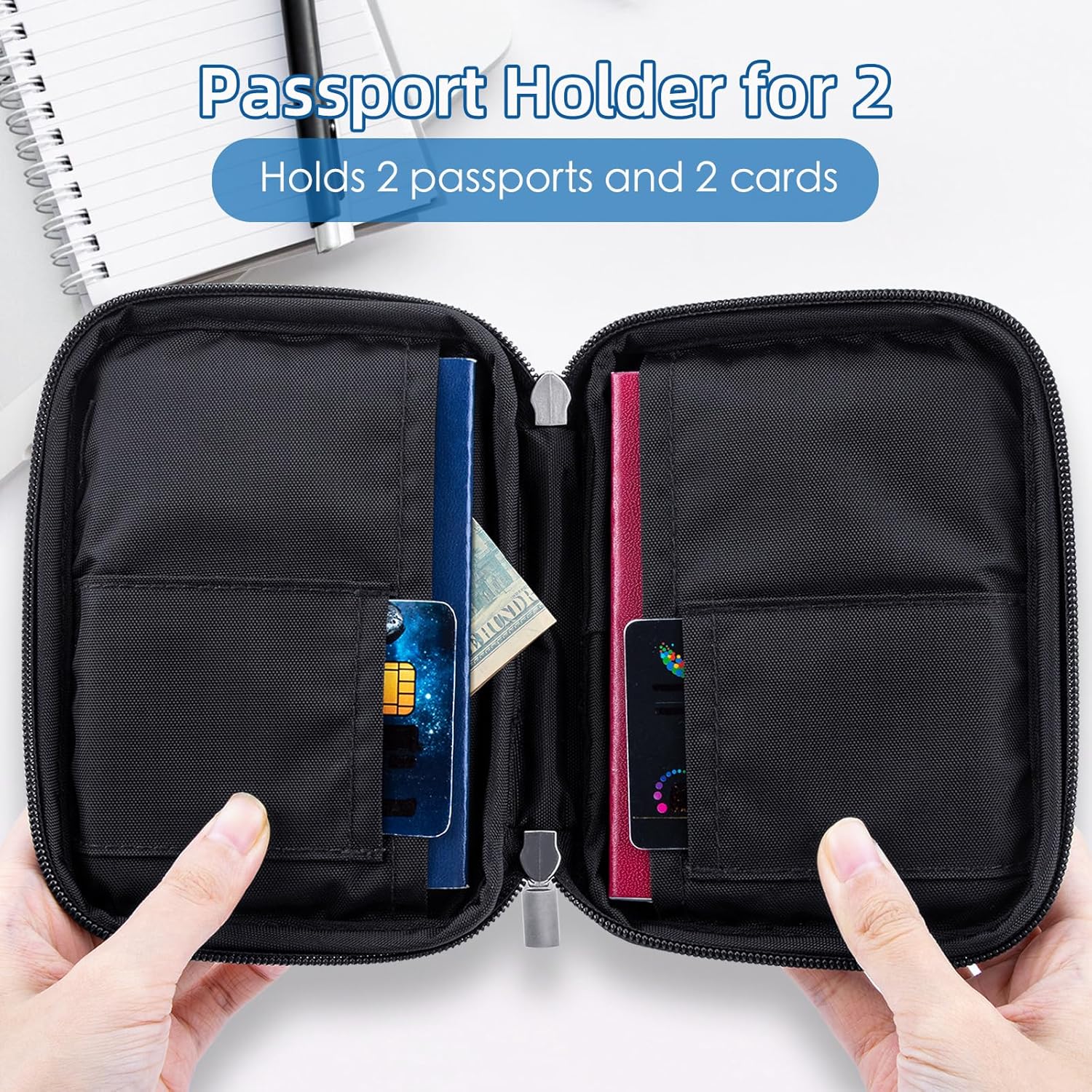 Double Passport Holder for Travel: This RFID-blocking passport holder securely stores 2 passport books and 2 card with RFID layers to prevent electronic theft. The external pocket can hold earphones, tickets, coins, charging cables, etc. Perfect for family trips and traveling with friends, making your journey more convenient and secure
