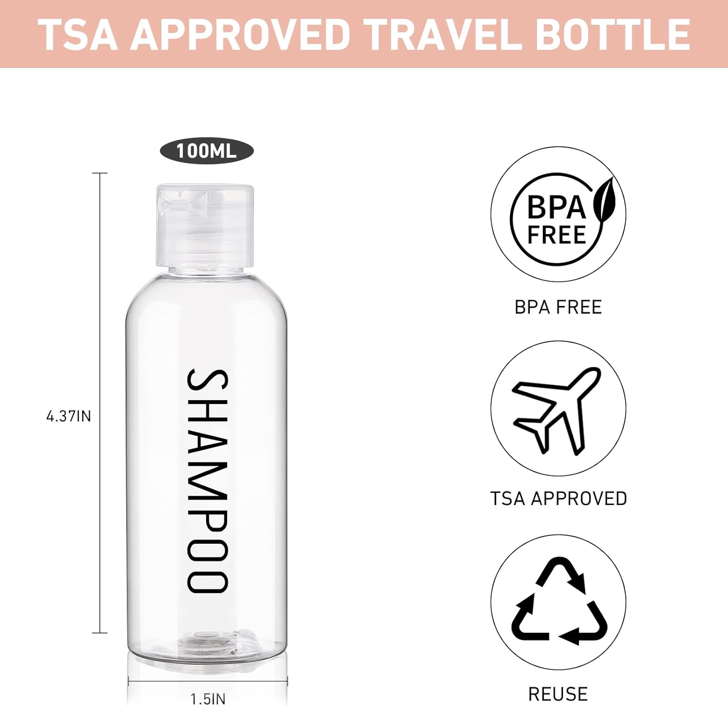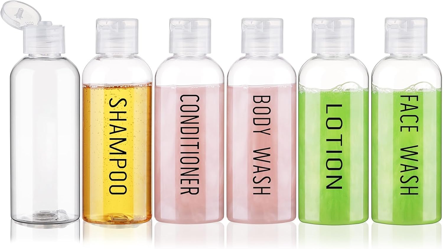 Welcome to the world of effortless travel organization with our travel bottles for toiletries 6 Pack in chic clear. Elevate your travel experience with these meticulously crafted bottles designed for style, convenience, and functionality. 1x Travel Shampoo Bottle;1x Travel Conditioner Bottle;1x Travel Body Wash Bottle;1x Lotion Bottle;1x Face Wash Bottle;1x Travel Empty Bottle.Customizable LabelsEnhance your travel with pre-printed “SHAMPOO,” “CONDITIONER,” “BODY WASH,” “LOTION,” and “FACE WASH”, ensuring you never mix up your essentials. The additional blank travel size bottles allows you to personalize according to your specific needs.Leak-proof AssuranceCrafted with precision, our small travel containers boast a leak-proof design and secure flip caps, providing peace of mind during your travels. Say goodbye to spills and leaks in your luggage. TSA ApprovalDesigned to meet TSA guidelines, these 3.4 oz TSA approved toiletry bottles are your hassle-free solution for breezing through airport security checkpoints. Travel with confidence and ease.Compact and Lightweight Experience the perfect blend of functionality and portability. These compact and lightweight travel toiletries bottles effortlessly fit into any travel bag or purse, offering convenience without compromising on space.Versatile Utility Unleash the versatility of our travel bottles, suitable for a wide range of toiletries. From shampoo and conditioner to makeup remover and beyond, these travel bottles leak proof are your go-to companion for any journey.Embark on your next adventure with confidence and style. Our travel size toiletries bottles 6 Pack in sophisticated clear ensure you travel smarter, lighter, and more organized. Elevate your travel game and indulge in the luxury of hassle-free journeys.