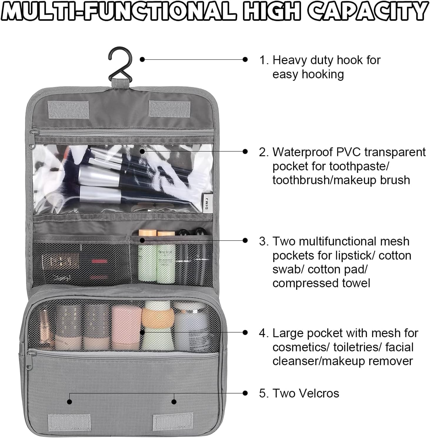 Built-in hook allows hanging the toiletry kit from towel rack, coat hook or wherever is available, making your toiletries and cosmetics displayed well for easy access and saves counter space as well. with several pockets ,it can neatly organize your large/small skin-care products, cosmetics, lotion, shampoo, conditioner, toothbrushes and other items you need.