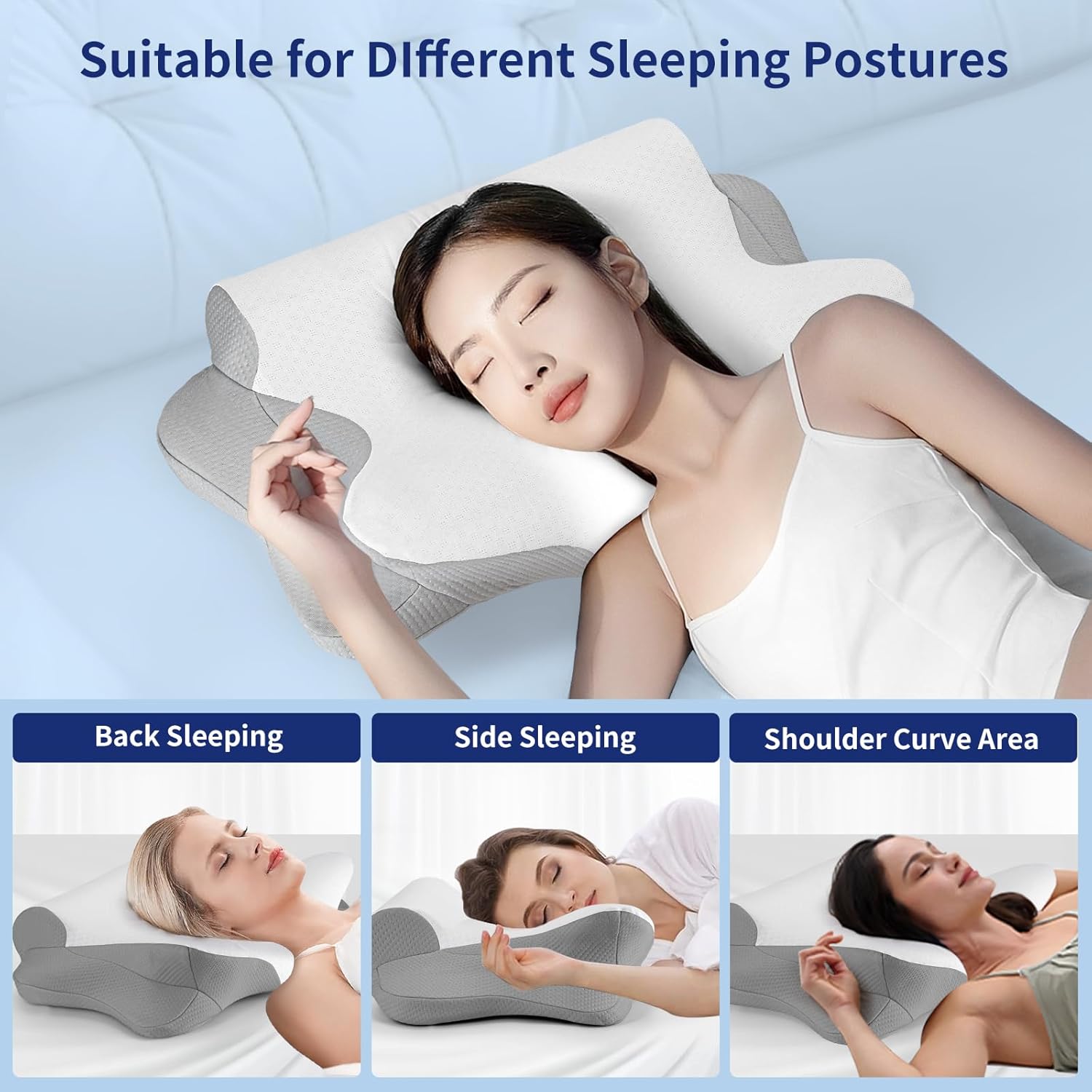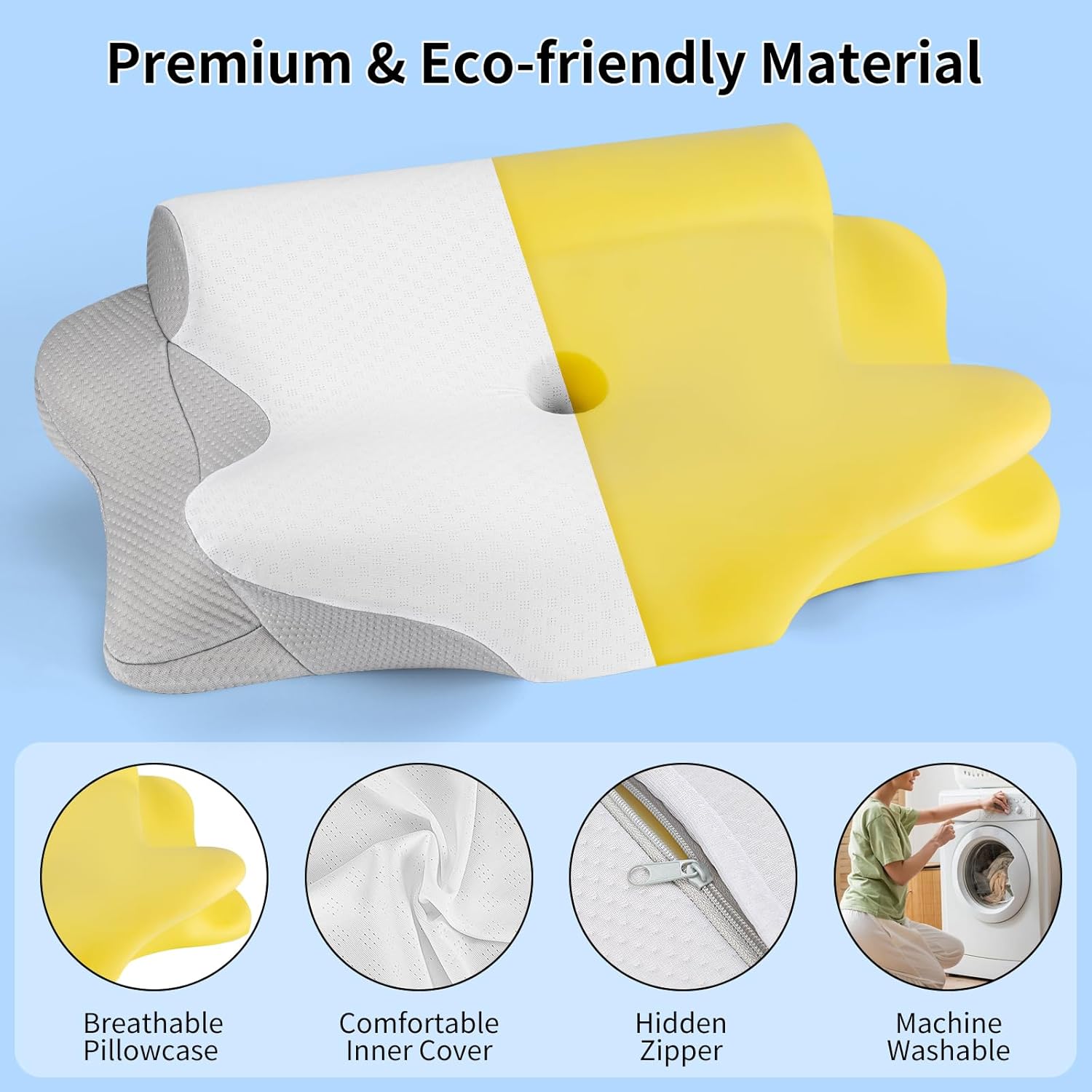 4.【Ergonomic design】Contour Pillows for Neck and Shoulder Pain , well designed to support by following the natural curve of your more restful sleep The side sleeping pillow has a double-layer high-quality pillowcase, which is soft and stretches and contracts well with the pillow core. It is removable, has a zipper and is machine washable