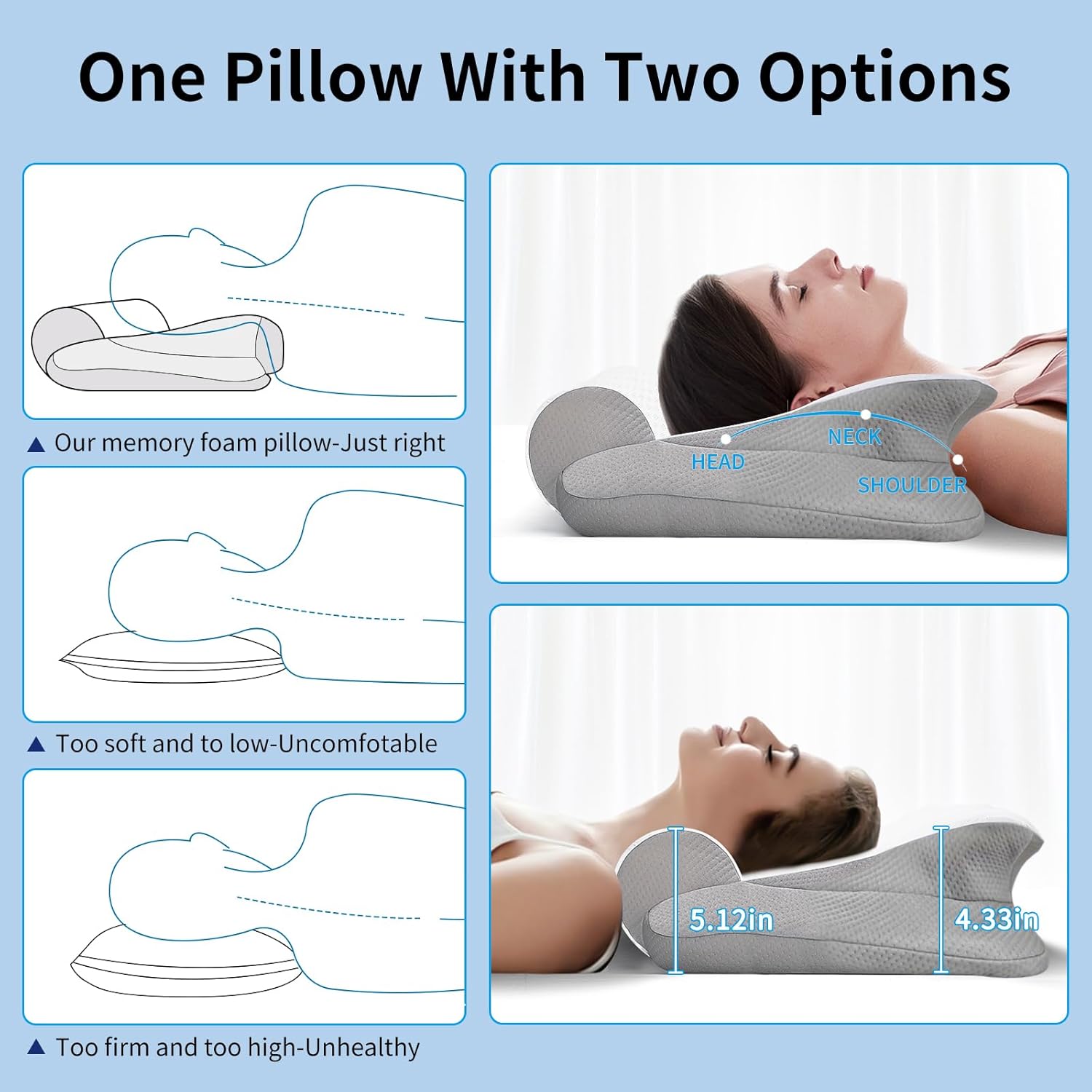 1.【Neck pain disappeared】:Incorporating a 2-in-1 cervical support design, this pillow is suitable for a variety of sleeping positions and provides optimum support for the neck, shoulders and head.With a height of 10cm to 14cm, it effectively improves the quality of sleep.